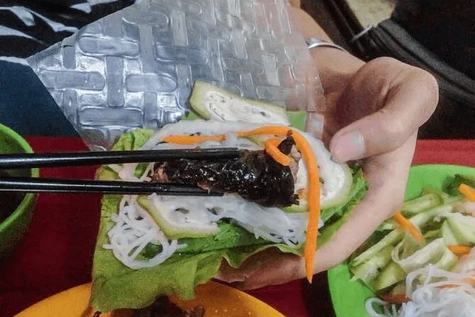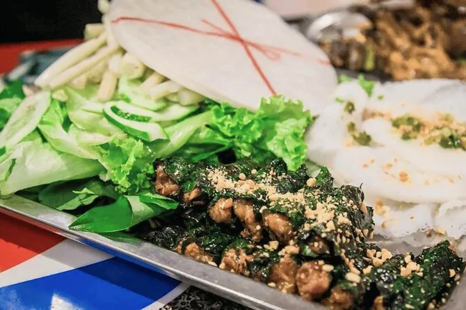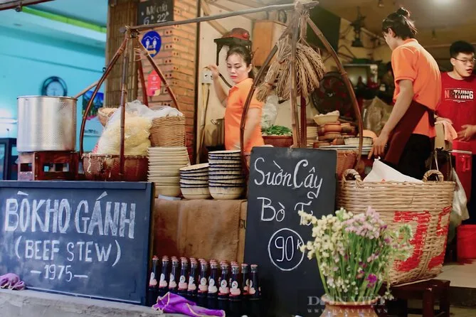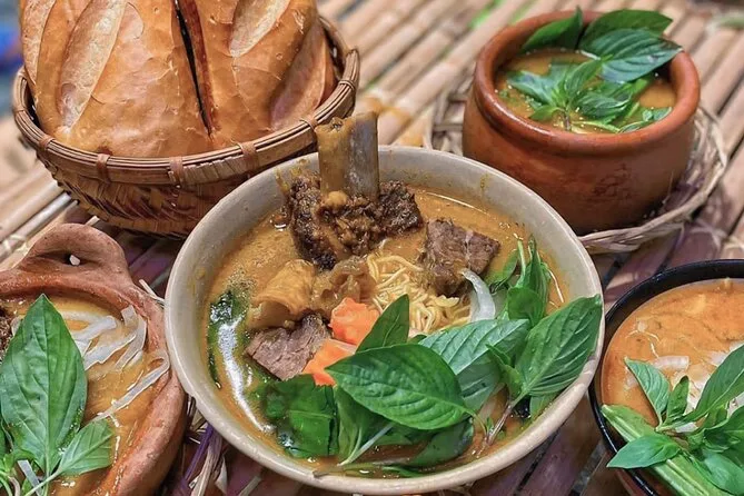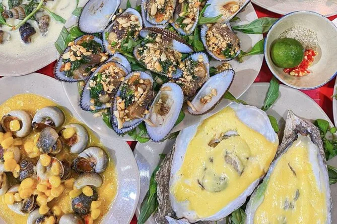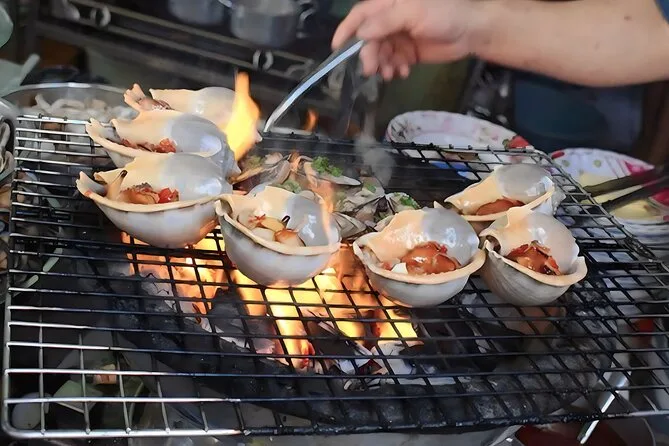 The tour features bò kho gánh (beef stew), bánh xèo (Vietnamese crêpe), pulled chicken salad, chargrilled meats/seafood, bò lá lốt (beef in betel leaves), chuoi nuong (grilled plantain), snails & seafood at Ốc Đào.