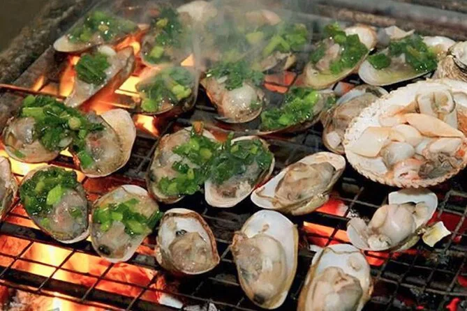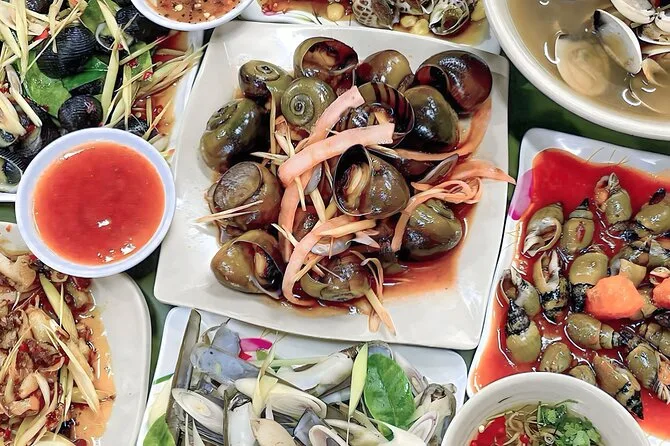 I thought I’d be full by then but no — we headed off for bò lá lốt (minced beef wrapped in betel leaves), which sizzled on a little charcoal grill right at our table. That smoky leaf smell stuck to my hands all night. Dessert was chuoi nuong: grilled plantain smothered in coconut milk sauce, sweet and salty at once. The final stop was Ốc Đào for snails and seafood with cold Saigon beer — honestly, I hesitated at first (snails!) but Linh showed me how to scoop them out and dip them in spicy salt-lime sauce. Not bad at all.