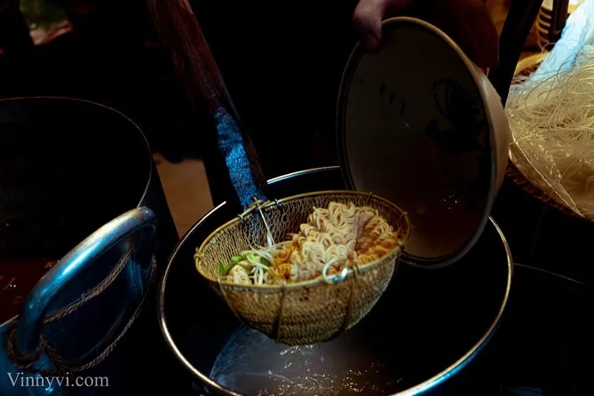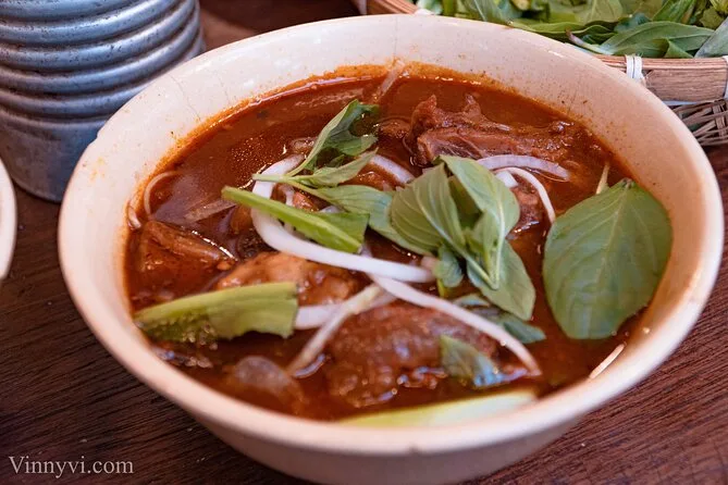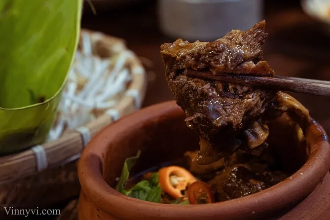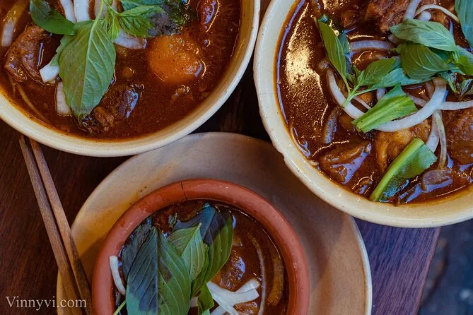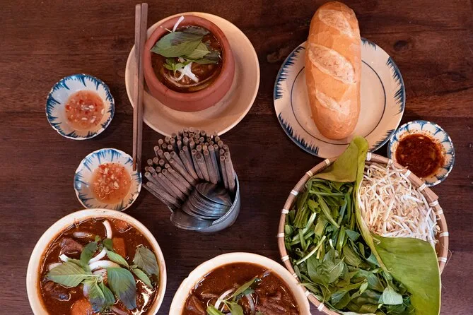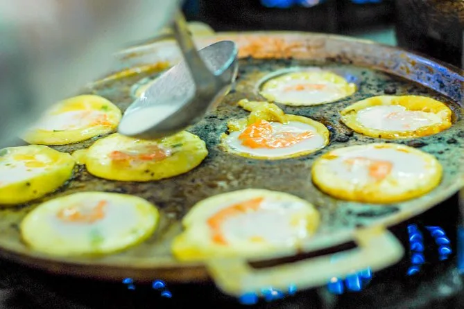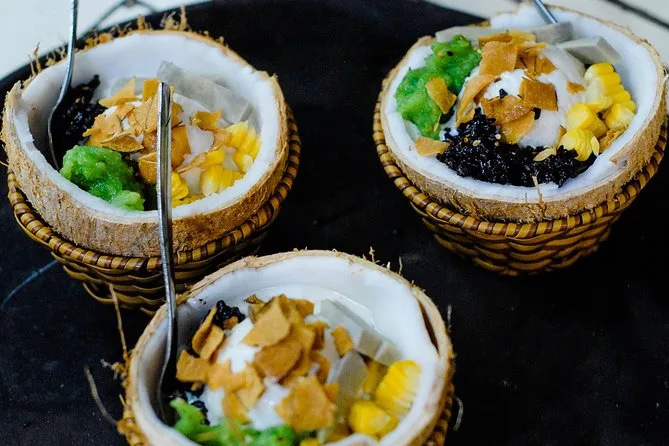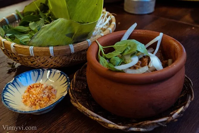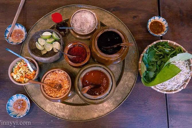 You’ll try around nine dishes including rice pancakes (bánh xèo & bánh khọt), beef stew (bò kho), banana girdle-cakes or Vietnamese pizza, coconut ice cream or jelly, seafood or BBQ meat meal (if allergic), flan dessert with caramel & coffee, plus homemade sticky rice wine.