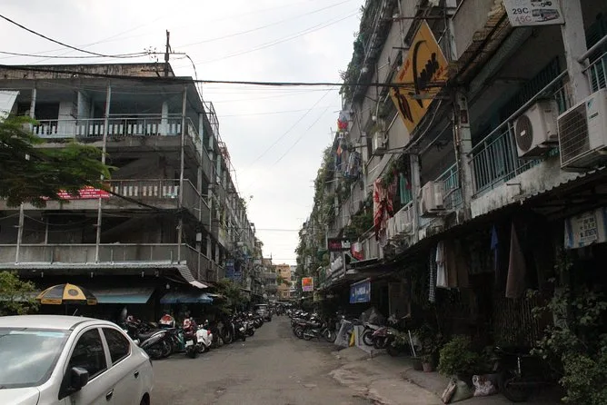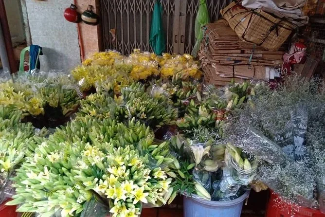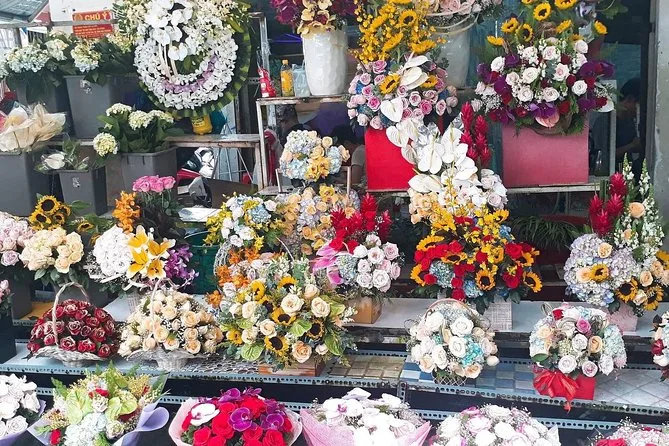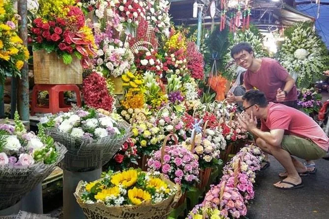 We rode over a bridge between District 5 and an island—I think Minh called it Bình Đông?—and suddenly everything changed: glassy new towers behind us, older houses leaning into each other ahead. It was jarring but weirdly beautiful. The flower market came next; buckets overflowing with marigolds and lilies, petals sticking to my shoes when I got off the bike (I’m still finding one in my backpack). The air was thick with perfume and exhaust.
