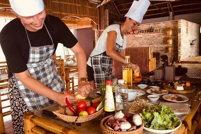 The experience includes market visit, basket boat trip through Cam Thanh coconut forest, fishing activity, welcome drink, cooking class with four main dishes plus side dishes and dessert.