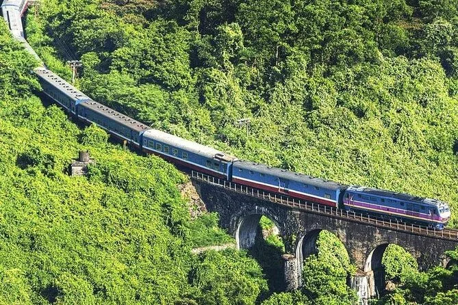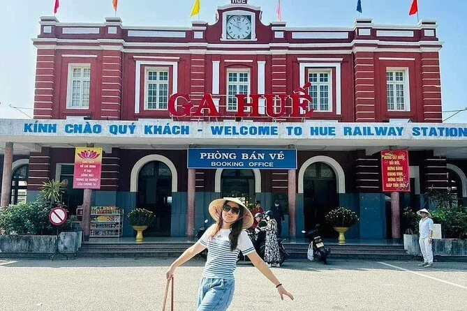 Your day includes early morning hotel pickup in Da Nang city center, a scenic one-way train ticket over Hai Van Pass to Lang Co station with views of beaches and mountains, comfortable transfers between sites by air-conditioned coach with bottled water provided throughout. Entry tickets for Hue Imperial City, Khai Dinh Tomb, and Thien Mu Pagoda are covered (if selected), plus a traditional Vietnamese lunch with vegetarian options before returning back to your hotel by evening.