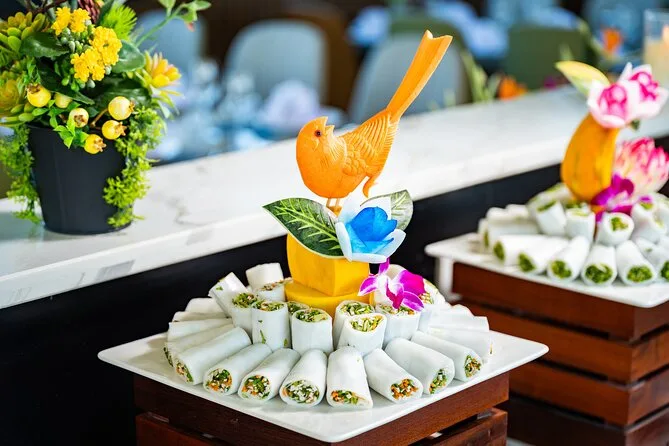 A buffet lunch featuring fresh seafood is served onboard after boarding at Tuan Chau Harbor.