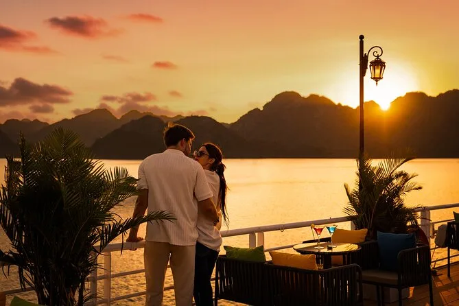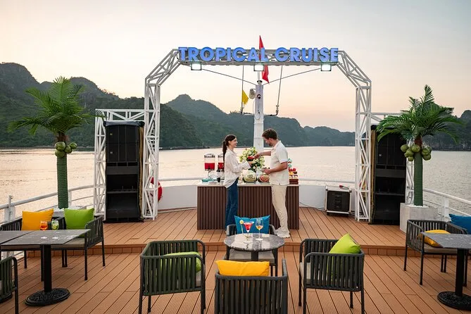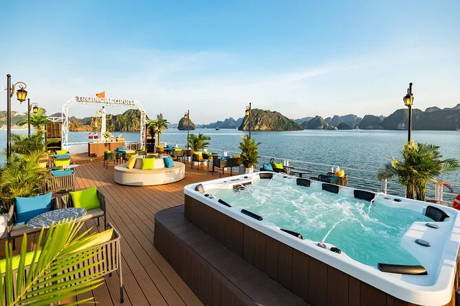 The sunset party wasn’t what I pictured—less formal, more people sprawled on deck chairs with wine or tea in hand while music played quietly. Someone handed me a piece of cake; someone else started dancing barefoot. I sat in the Jacuzzi for a bit watching orange light spill over Lan Ha Bay before we turned back toward Tuan Chau Harbor. Still thinking about that view now—it sneaks up on you later.