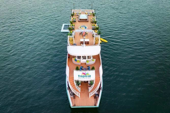 Your day includes round-trip hotel pickup from Hanoi Old Quarter or Opera House, all entrance fees for attractions like Trung Trang Cave and Cat Ba’s ecological museum, two-way electric car rides across Cat Ba Island’s scenic roads, use of kayaks and swimming pool equipment on Lan Ha Bay plus a fresh seafood buffet lunch onboard (unless starting at Cat Ba Town), English-speaking local guide throughout, welcome drink on arrival and a sunset party with wine or tea before heading back in the evening.