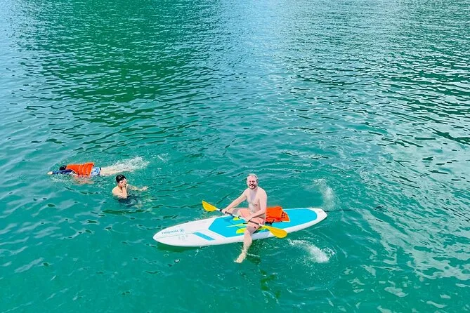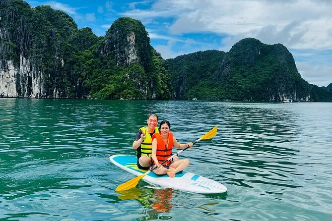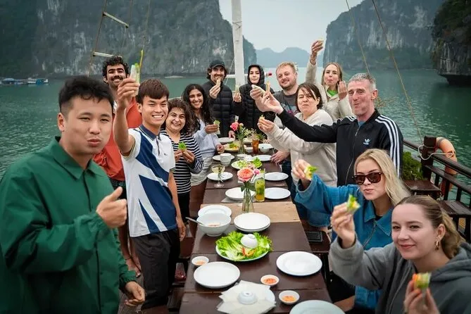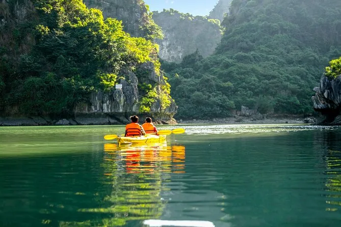 Your day includes hotel pickup either from Hanoi or Cat Ba town (depending on where you start), all entrance tickets for Lan Ha & Ha Long Bay areas, kayaking gear for exploring caves and lagoons, time to swim at quiet beaches, a traditional Vietnamese lunch with vegetarian options if needed, plus a sunset cooking class before returning by bus or boat in the evening.