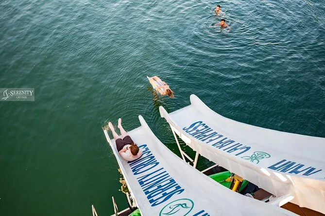 Around 11am, we reached Beo Harbour. If you’re coming from elsewhere, it’s easy to spot—just follow the line of snack stalls selling fresh coconut and sticky rice cakes. The boat itself felt more like a floating lounge than a ferry: wide decks, a rooftop bar with beanbags, even a water slide (which I didn’t expect!). After a quick welcome drink and cold towel (needed that), we set off into Lan Ha Bay.
