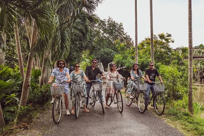 Your day includes hotel pickup and drop-off within central District 1 of Ho Chi Minh City, all entrance fees for sites around Cai Be in the Mekong Delta, guided boat trips along the river canals, an English-speaking local guide throughout, use of bicycles for exploring rural lanes after lunch, plus a hands-on Vietnamese cooking class followed by lunch at a tropical garden restaurant before heading back to the city by air-conditioned van.