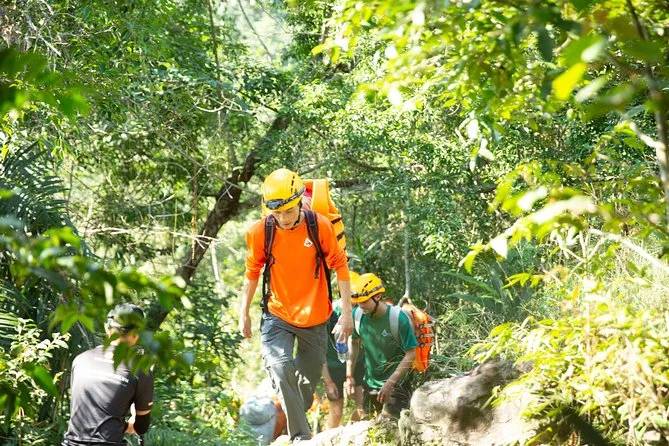 The trek covers about 8 kilometers through jungle and rocky terrain.