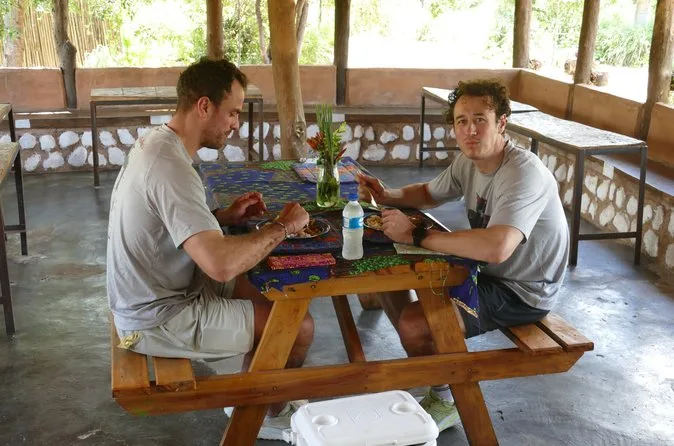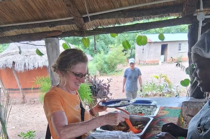 Back at the farm, we sat under a mopane tree while lunch was set out: sadza (that thick maize porridge), chicken cooked over open coals, and vegetables straight from their garden. It’s simple food but honestly tastes better after a long walk. Bottled water is included but I’d bring an extra just in case—it gets hot fast once the sun’s up.