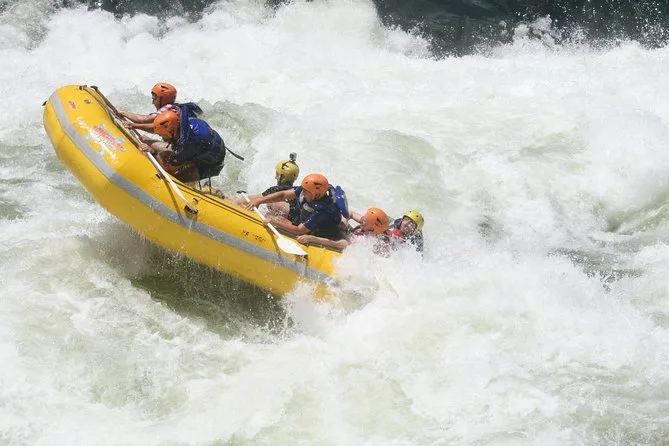 The full-day trip includes hotel pickup, safety briefing, rafting several rapids below Victoria Falls, lunch at the top of the gorge, and return transfer.
